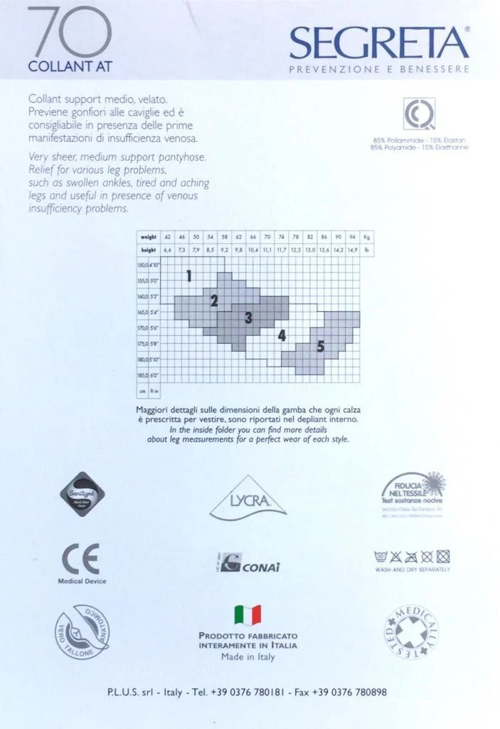 Collant Segreta 70 compressione graduata IBICI support medio, velato, maglia a rete. Corpino rinforzato con elastico applicato, cuciture piatte, tassello in cotone. Con vero tallone anatomico, …