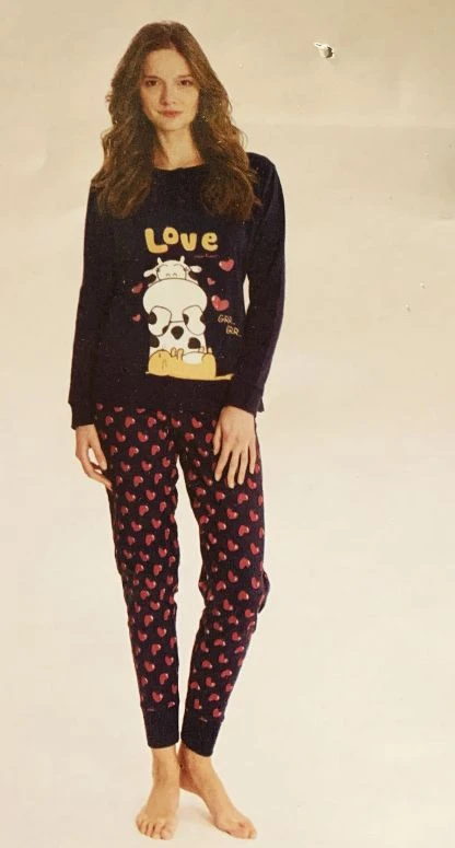 Pigiama Donna 100% cotone caldo Crazy Farm 15656 fine serie Outlet Pigiama moda con maglia aperta a serafino con stampa e pantalone fantasia cuori