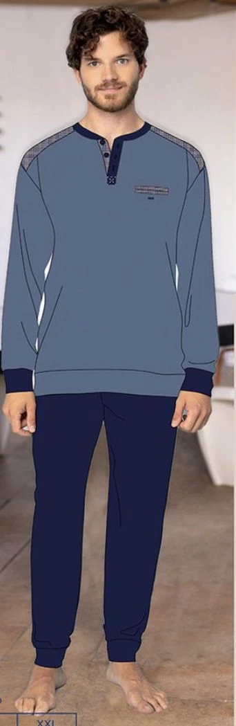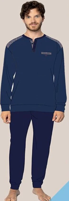 Pigiama Uomo 100% caldo cotone invernale Irge 2410 maglia aperta a serafino con bottoni e polsini con taschino avanti pantalone tinta unita con bordo in contrasto effetto tuta casa il tutto 100% cotone caldo invernale interlok. Composizione 100% cotone pesante invernale Disponibile nelle taglie M/48 L/50 XL/52 XXL/54 nei colori Blu e Avion/blu